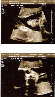 We had our doctors appointment on 7/16/07 and it was a long one. I did the one hour glucose test first, which wasn’t fun, but wasn’t too bad either. Then we had our ultrasound, which showed that the babies were laying across the bottom of my belly, stacked one on top of the other like a triple decker bus. All heads are laying on