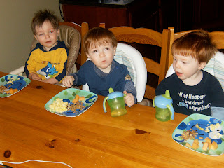 All of the boys are sitting at the table with no trays and eating with utensils a good amount of the time. Ryan and Gary LOVE Bacon and meats. Ben on the other hand is our carb boy. All of them like corn, Pirate’s Booty, Cheetos and hot dogs. Mac and Cheese is a fave too along with any pasta with red sauce. We’ve graduated from sippy cups with handles to “new cups” and plastic plates with Monkeys on them. We still had a few from when Kaitlyn and Gillian were little, so on occasion they eat off of a Barbie or Power Puff Girl plate. I don’t think it will cause too much damage.